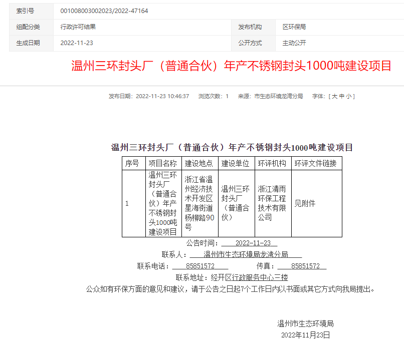 11月23日,溫州市生態(tài)環(huán)境局龍灣分局受理溫州三環(huán)封頭廠(普通合伙)年產(chǎn)不銹鋼封