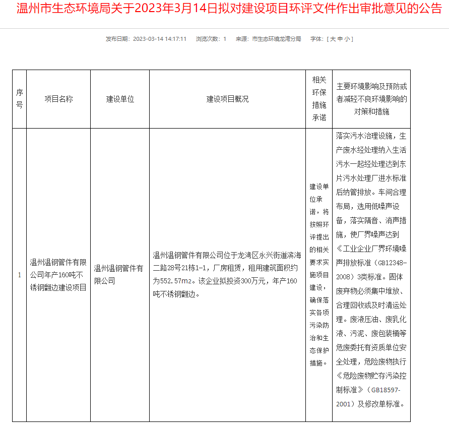 3月14日,溫州市生態(tài)環(huán)境局龍灣分局就溫州溫鋼管件有限公司年產(chǎn)160噸不銹鋼翻邊